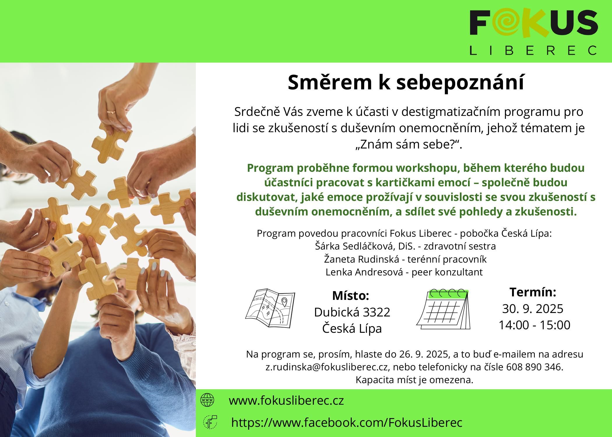 Zveme Vás na destigmatizační program na téma „Znám sám sebe?“ ve Fokus Česká Lípa dne 30.9.2025. Program je určen pro osoby se zkušeností s duševním onemocněním. Kapacita míst je omezena. Přihlášení do 26.9.2025.