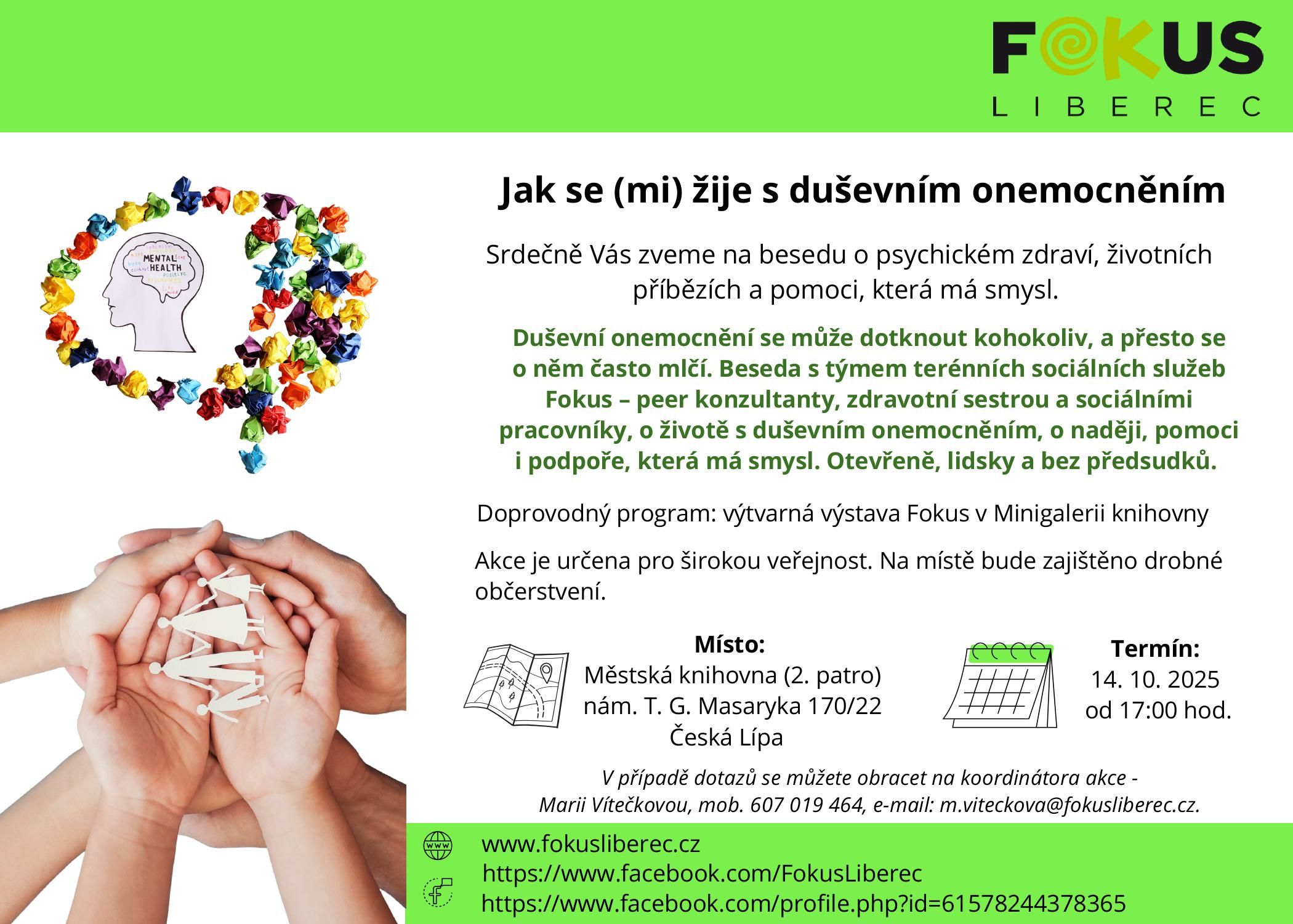 14/10Fokus Liberec – pobočka Česká Lípa Vás srdečně zve na besedu o psychickém zdraví, životních příbězích a pomoci, která má smysl, dne 14. 10. 2025 od 17:00 hod. v Městské knihovně, náměstí T. G. Masaryka 170/22, Česká Lípa (čítárna, 2. patro). Akce je určena pro všechny, které toto téma zajímá.