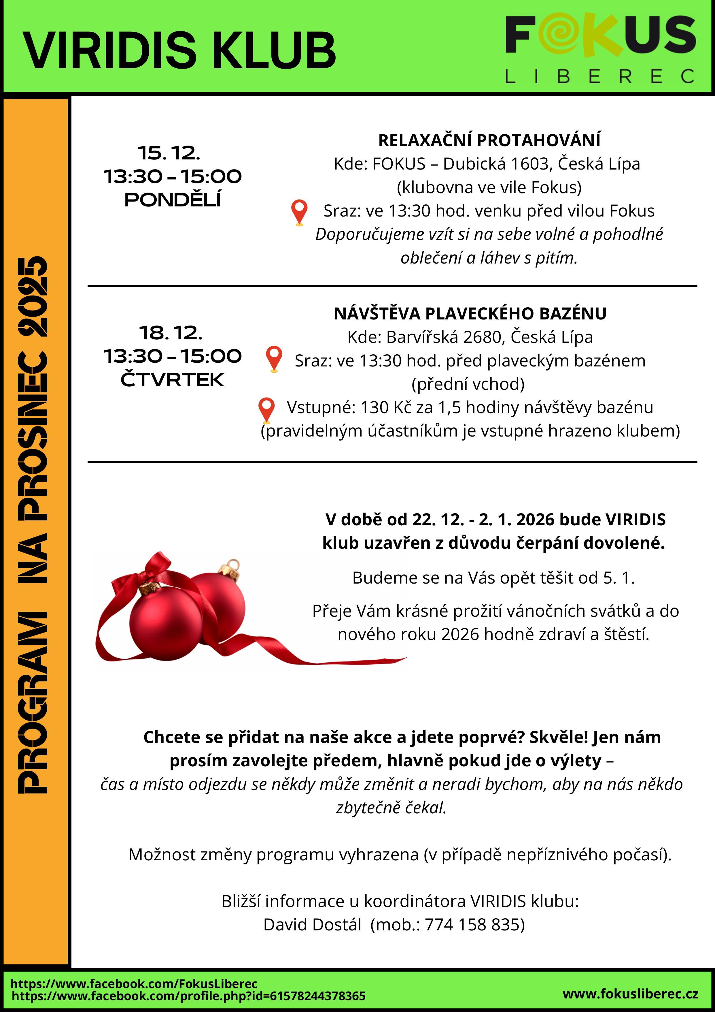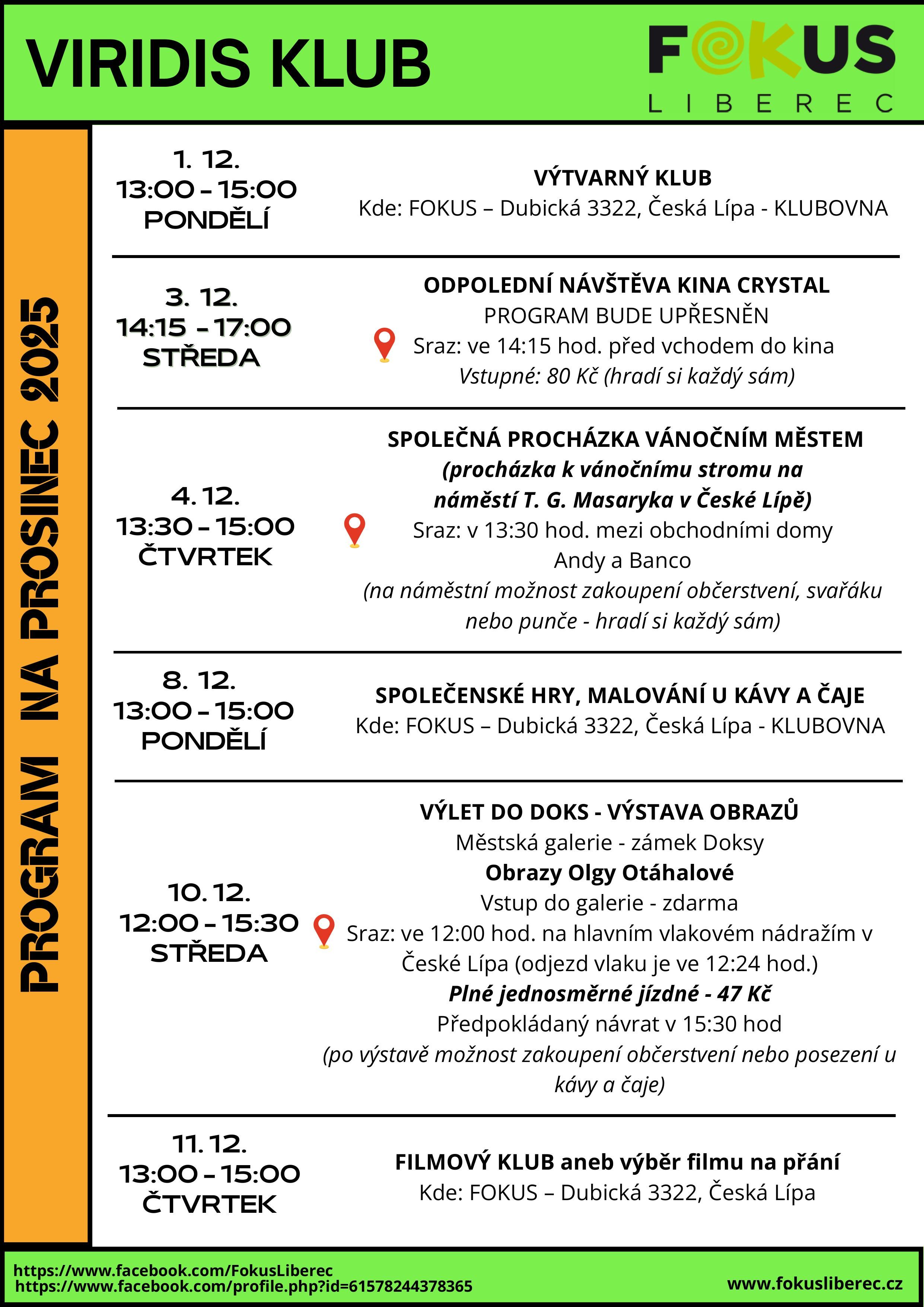 Program VIRIDIS klubu na měsíc prosinec na pobočce Fokus Česká Lípa.