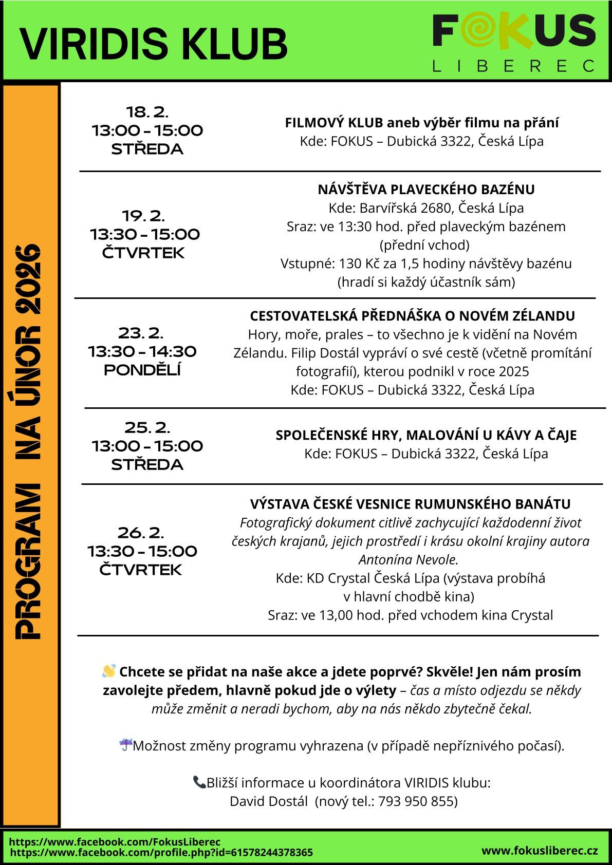 Program klubu VIRIDIS Česká Lípa na měsíc únor 2026